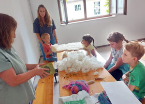 Mit Spaß und großer Neugierde haben die Kinder erforscht wie früher Schafswolle versponnen, Stoff gewebt, Wäsche gewaschen und auch in Bernhardsthal Seidenraupen auf Maulbeerbäumen gezüchtet wurden.